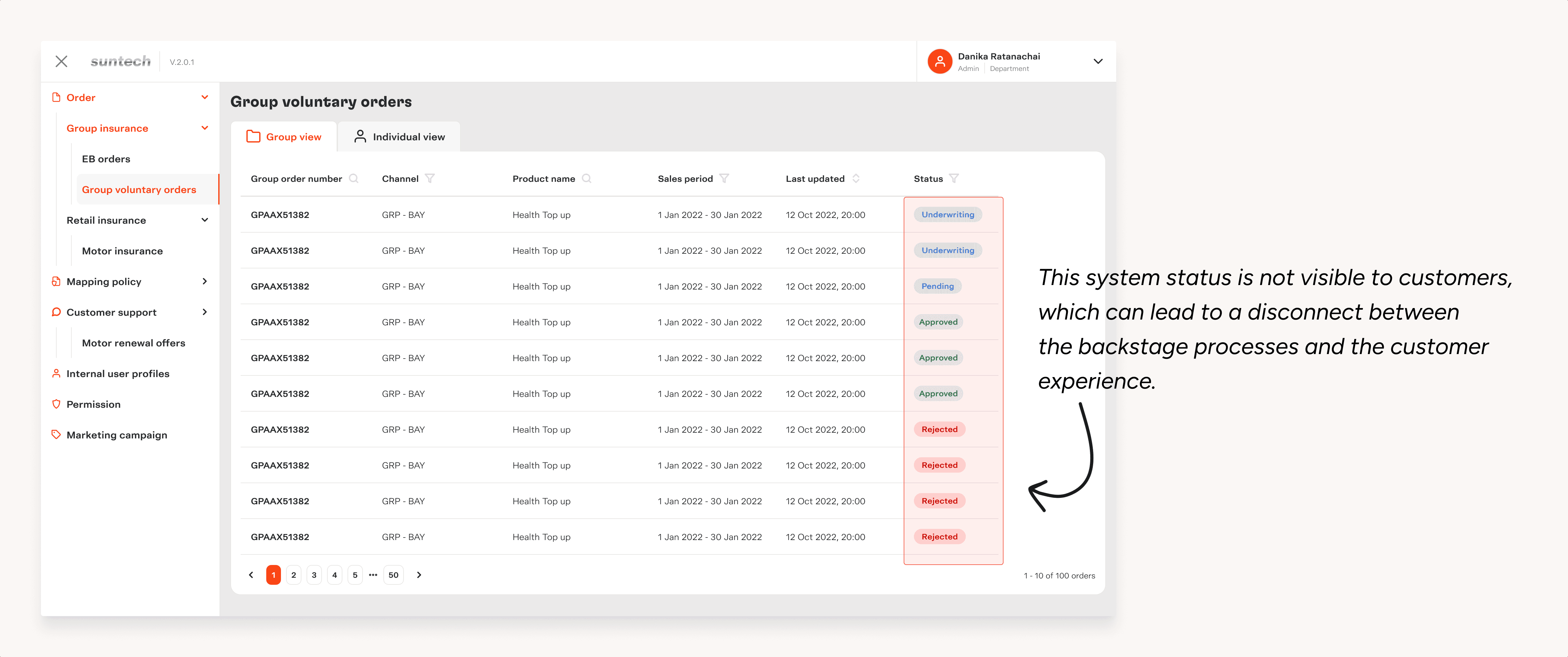 In the backstages, once an order is received, staff update the status within the back-office system, which is used internally to track the progress of the approval process.