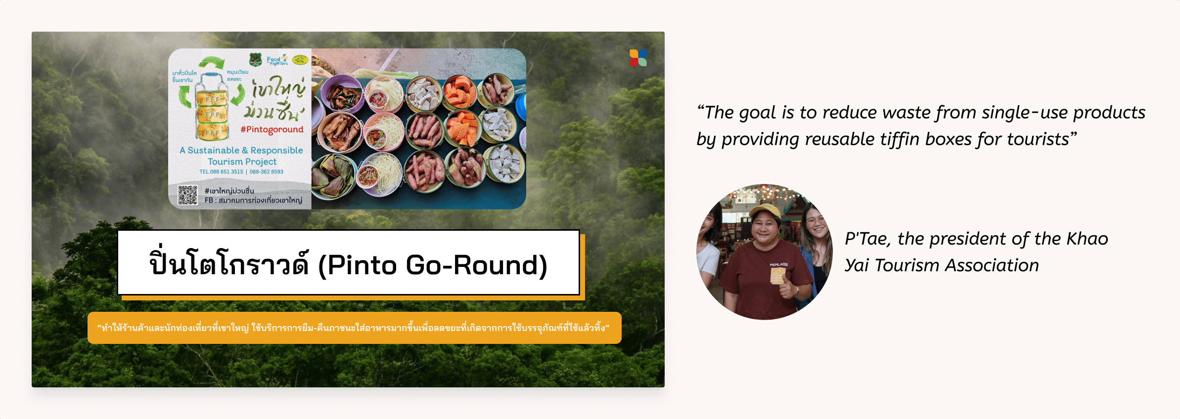 The challenge began with a request to improve the Pinto Go-Round project, introduced by P'Tae, the president of the Khao Yai Tourism Association. The goals is to waste from single-use products by providing reusable tiffin boxes for tourists visiting Khao Yai National Park to use during their meals.