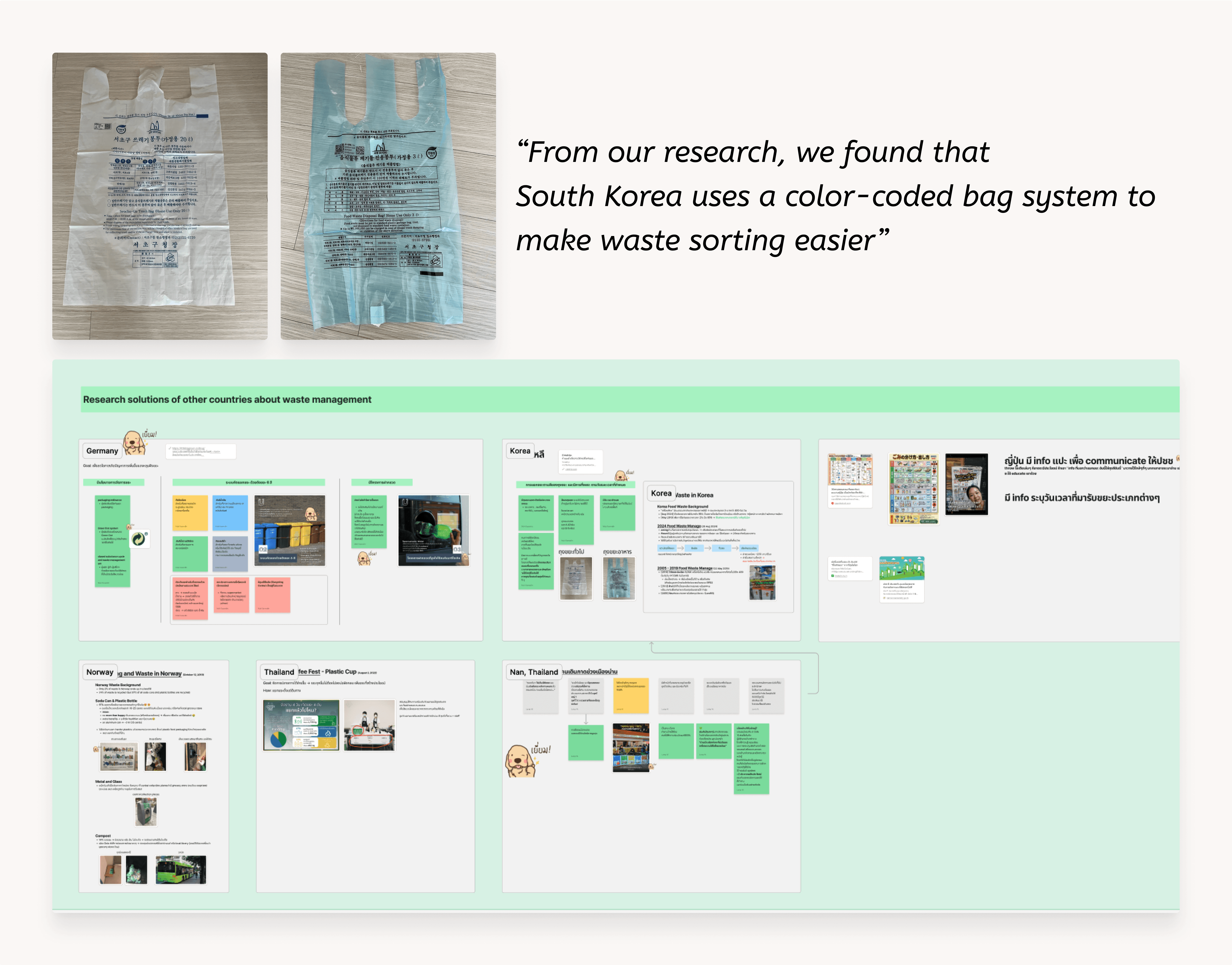 We conducted desk research to explore global methods for encouraging people to adopt waste-sorting behaviors. One approach that caught our attention was the system used in South Korea, where color-coded bags are utilized to make waste sorting easier.