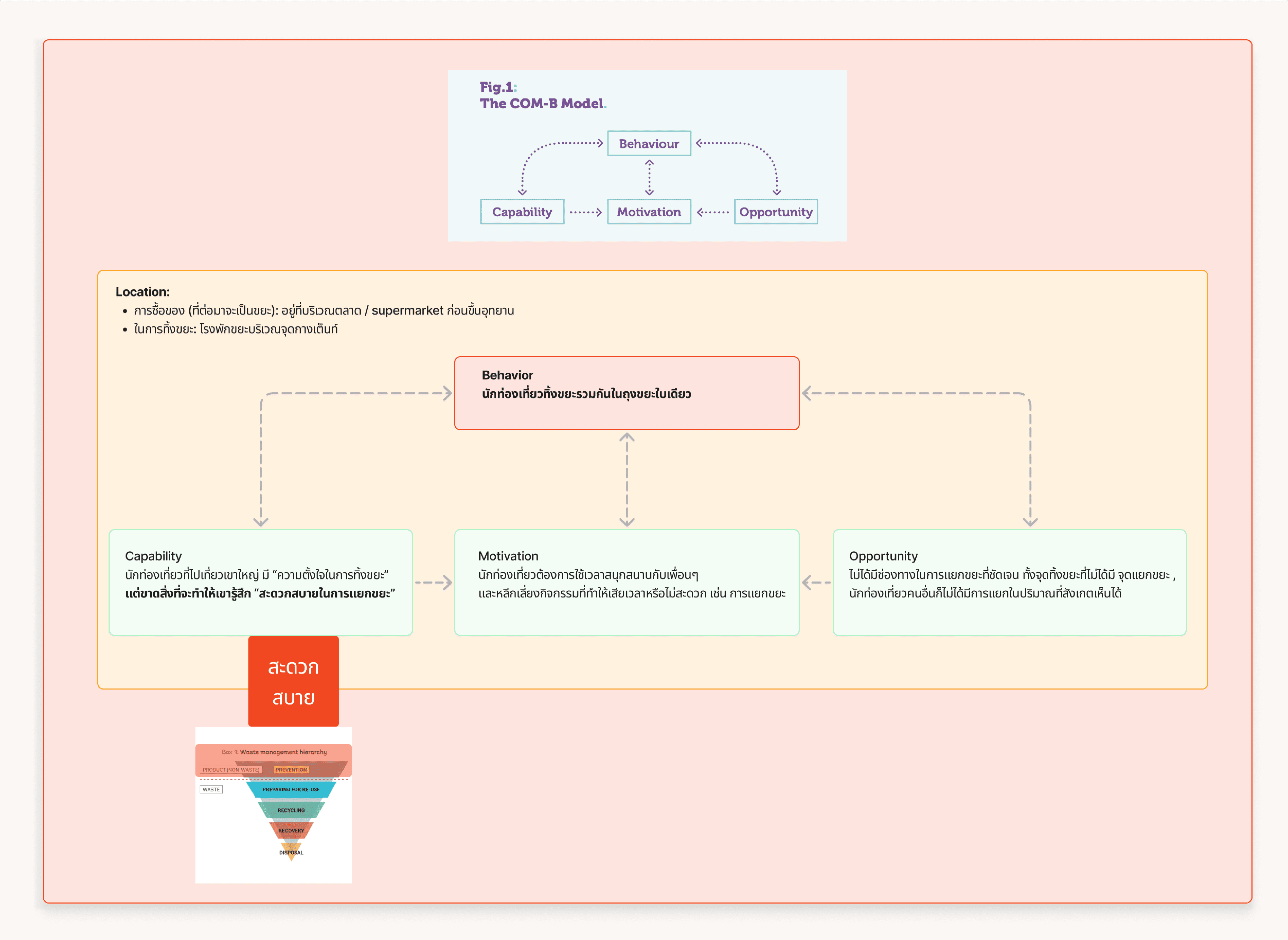 From our interviews, we found that many tourists do not sort their waste while camping. So, we decided to focus on understanding this behavior using the COM-B Model framework, particularly looking at their capability to manage waste.